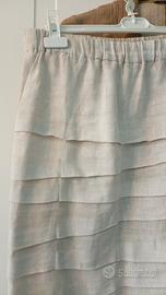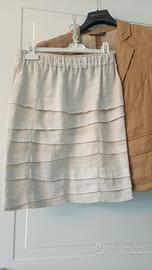 vendo tre pezzi : completo giacca destrutturata manica a 3/4 camicia scollo coreana e gonna al ginocchio a balze tutto puro lino. colori écru, bianco e tabacco. Taglia M (40/42)