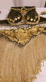 Completo per danza del ventre/bollywood, in velluto nero con monetine, perline e paillettes dorate, composto da: cintura riccamente decorata con monetine e centinaia di perline a cascata e paillettes, reggiseno imbottito con retina decorata da perline, monetine e paillettes, N.2 fascette per capelli, una dritta ed una con punta al centro, N. 2 bracciali a punta per la parte alta delle braccia più una corta fascetta che si allaccia con dei gancetti e può essere usata o come cavigliera o come braccialetto.