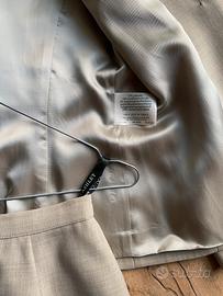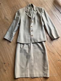Completo elegante misto lana e polyestere, gonna e giacca colore beige chiaro, giacca con abbotonatura a scomparsa, gonna con zip e bottone retro vita spacco sul retro, fodera interna, taglia 34, marca LAURA ASHLEY