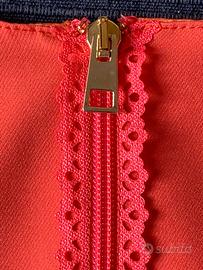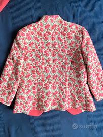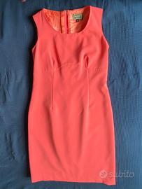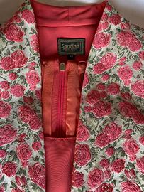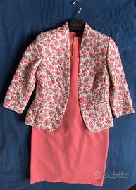 Elegante completo sartoriale composto da giacca a un bottone e vestito color salmone al ginocchio, taglia 42, made in Italy, ideale per cerimonie e cocktail. La giacca sagomata è lavorata a tessuto damascato a piccole roselline e richiama il colore del vestito in alcuni dettagli come l'asola e il bottone, la fodera e il colore dei fiori su fondo bianco. Due taschine a taglio sul davanti. Scollatura a V senza revers, spalle imbottite e maniche a 3/4. Misura giacca: spalle cm. 38, petto cm. 44, lunghezza cm. 59. Composizione giacca: 77% cotone, 21% viscosa, 2% elastane; fodera 66% acetato e 34% viscosa. Il vestito, leggermente sagomato e tutto foderato, scollo tondo e spalla larga senza maniche è chiuso sul dietro da una lunga cerniera con cursore dorato e applicazione di pizzo in tinta. Misura vestito: petto cm. 41, vita cm. 40, lunghezza cm. 94, spalle cm. 33, fianchi cm. 48. Composizione: poliestere 50%, viscosa 47%, elastane 2%. Si raccomanda di verificare le misure fornite con i propri capi. Indossato una sola volta.