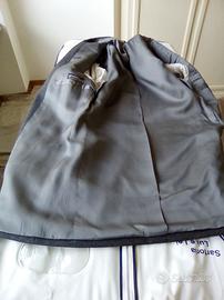 Abito uomo grigio nuovo mai usato per autunno-inverno in consistente tessuto di pura lana vergine, costituito da giacca+2 pantaloni. Fatto su misura, confezione e finiture accurate. Custodia porta abiti con logo sartoria. Caratteristiche e misure esterne in cm giacca taglia 48-50: - fodera grigia su tutto il lato interno, bianca con righe nelle maniche - all'esterno 1 taschino in alto a sx (largo L 10 cm, profondo H 16,5) e 2 tasche in basso (L 15,5 x H 20,5). La tasca dx ha all'interno 1 taschino portamonete L10 x H 9 - all'interno 2 taschini in alto (sx L 12xH 16; dx L 13 x H 17 chiuso con bottone) e 1 in basso a sx L 11 x H 14,5 - 3 bottoni anteriori + 3 bottoncini ai polsi - Altezza da collo a fondo 84,5 - Altezza da omero a fondo 77 - Altezza da ascella a fondo 53 - Lunghezza maniche da omero a polso 64,5; da ascella a polso 43,5 - Larghezza a livello spalle 50 - Giro petto giacca chiusa 100 - Giro stomaco c.s. 94 - Giro vita c.s. 92 Caratteristiche e misure in cm pantaloni taglia UE 94: - 2 pinces a dx, 2 a sx - fodera grigia su lato interno anteriore di bacino e gambe fino a 36 cm da fondo - cerniera lampo anteriore RiRi 17 cm più bottone interno e gancio alla vita, 6 passanti cintura alla vita - 2 taschini posteriori L 12,5 x H 16 chiusi con bottone, 1 taschino portamonete anteriore dx 7x7cm - Giro vita interno utile 78 cm +2x4 cm risvolti interni - Giro bacino 90 cm +2x2 cm risvolti - Lunghezza totale da vita a fondo 109,5 - Lunghezza gambe da cavallo a fondo 84,5 - Giro coscia misurata sotto cavallo 66 - Orlo: risvolto esterno H 3,5 cm per un pantalone; liscio per l'altro+8 cm stoffa risvoltata all'interno - Scampolo stoffa 75x68 Custodia L 56 x H 125, cerniera 112 cm Pesi: - giacca 1050g - 1 pantalone 675-685g - custodia 450 g Vendo a Torino pza Costantino - 1 pantalone 70 Eu - giacca 140 Eu - giacca +1 pantalone 210 Eu - giacca+2 pantaloni+custodia 280 Eu Spedisco con TuttoSubito