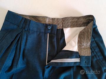 Meraviglioso Completo vintage Sartoria Titanus, 100% pura lana vergine, tessuto sottile, fresco e leggero. Giacca due bottoni, pantaloni con pence e risvolto alla caviglia, colore grigio/verde petrolio. Taglia 48 italiana.