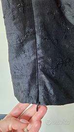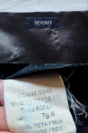 Seventy, completo in seta 100% gonna + top con piccoli ricami con strass tono su tono. Gonna a tubino con spacco laterale e chiusura con zip sul fianco sinistro. Il top ha scollo tondo sia davanti che dietro ed è chiuso da un zip laterale nascosta sul lato sinistro. Ottime condizioni