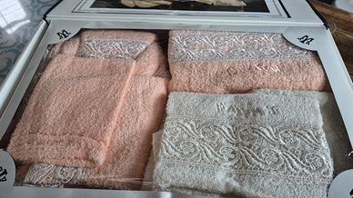 Mai usato, ancora confezionato nella sua scatola originale. Completo 19 pezzi ricamati di eccellente qualità. Composto da: 2 accappatoi, 2 asciugamani, 2 ospiti, 2 manopole, 4 tappeti, 4 pantofole, 1 bilancia, 1 copribilancia, 1 telo.