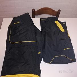 Descrizione: abbigliamento impermeabile semiimbottito ma non pesante, la giacca si indossa come un maglione e ha il cappuccio vari velcri e 5 tasche totali. I pantaloni hanno la cintura incorporata, 4 tasche, rinforzi su fondo schiena e ginocchia e si possono aprire le cerniere fino alle ginocchia per indossarli anche con stivaloni.