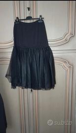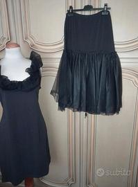 Completo taglia XL/46 miniabito/ tunica e gonna con balze di tulle come le rouches allo scollo. In maglia elasticizzata di cotone elastan colore prugna tendente al grigio ferro. Firmato Mais il est où le soleil? in cotone elasticizzato.