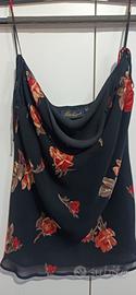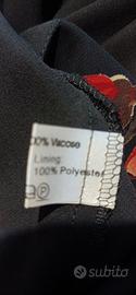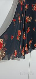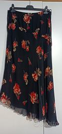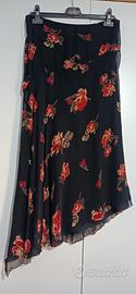 Completo con top e gonna asimmetrica floreale su fondo nero. Taglia It 44 . Gonna vita cm. 41, lunghezza lato corto cm. 76, lunghezza lato lungo cm. 99 . Vaporosa con trasparenza ma tutta foderata , anche il top è foderato.