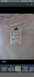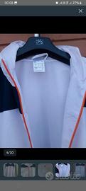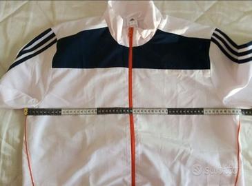 Completo della tuta originale Adidas acetata da uomo. Leggera. Ideale per inizio autunno/primavera. Giacca di colore bianco con leggerissimi riflessi tendenti al rosa ed inserti blu. Pantalone di colore blu con bande laterali bianche. Taglia: I 7; UK 42/44 (dovrebbe corrispondere ad una 52/54). Le misure della giacca sono: lunghezza torace (da ascella a ascella) 60 cm, lunghezza busto (misurata dall'asscella) 47 cm, lunghezza manica (misurata dalla spalla) 67 cm. Provata una volta e riporta nell'armadio per taglia errata. NUOVA