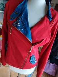 Completo rosso con un design unico e dettagli in denim. - Inserti in denim con borchie. - Zip dorate. - Collo in denim.