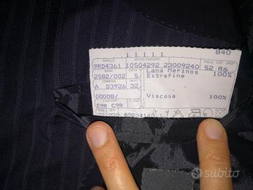 Vendo bellissimo completo uomo marca Reporter, taglia 52, giacca e pantaloni, blu a righe gessato, lana merinos e viscosa 100%, extrafine.