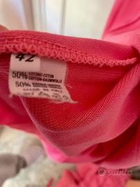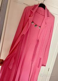 L'abito smanicato è un modello a tubino o dalla linea dritta, caratterizzato da un prezioso dettaglio gioiello applicato lungo lo scollo. Lo spolverino rosa ha una texture lavorata che aggiunge profondità al look. La lunghezza coordinata all'abito crea una silhouette elegante e slanciata. Idoneo per eventi o cerimonie. Come nuovo forse usato solo un volta