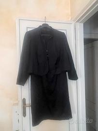 Vendo completo due pezzi sartoriale, vestito e giacchino fresco di lana, colore nero con decoro di passamanerie di raso: vestito, modello leggermente a trapezio con mezza manica; giacchino collo a pistagnina, chiusura a 4 bottoni di jais, stesso decoro del vestiito. Taglia 48-50, prezzo euro 55 trattabili