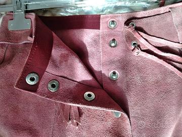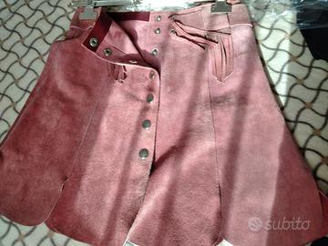 Bellissimo completo anni '70, Vintage, Taglia 40/42. Gonna in vera pelle scamosciata a spicchi tg. 40/42 color rosa antico con frange e cintura già inserita, scende sui fianchi, lunghezza : sopra il ginocchio. Vendesi anche separatamente Golfino M/M in cotone, confezionato a mano color azzurro. Vendesi anche separatamente. Tutto fatto lavare in tintoria.