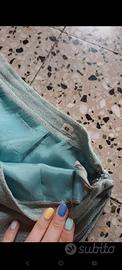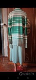Splendido completo Vintage in Jersey, cardigan e gonna. Ilaria of Florence Made in Italy. Non presenta difetti ne usura, pulito sia interno che esterno. Le misure corrispondono a una M. Cardigan: ascelle 46 cm, spalle 40 cm, lunghezza 69 cm; Gonna: girovita 66 cm, lunghezza 73 cm. Colore verde, verde acqua la gonna, e bianco.
