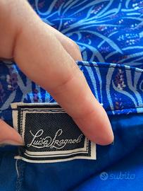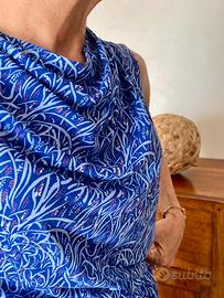 La camicia presenta sul davanti uno scollo a cappuccio e sul retro dei bottoni con funzione di apertura/chiusura. La gonna presenta un cinturino che tende a mettere in risalto il punto vita, una fodera interna e due spacchetti laterali per agevolare i movimenti. Non è specificata la tipologia di tessuto ma sembrerebbe crepe di seta, fantasia botanica nei colori blu/viola. Vestibilità 40/42