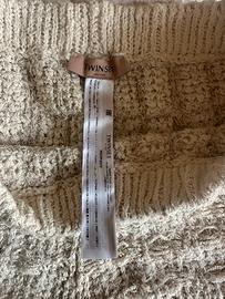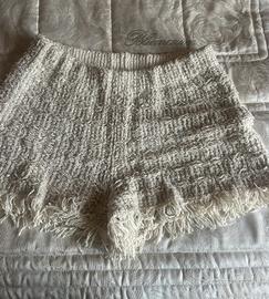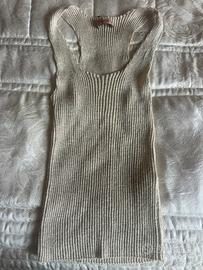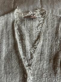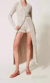 Completto Twinset primaverile. Colore beige dorato. Tre pezzi cardigan lungo + short + canotta. Tutto in stofa Bouclé con lurex elasticizzata. Molto comodo da indossare. Tg S , molto comoda.