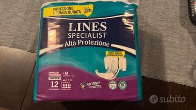 Una confezione di Pannoloni a mutandina Unisex da 12 pezzi LINES Specialist Alta Protezione Taglia M, e una confezione di Pannoloni Tena Flex Super S da 30 Pezzi Ausilio Assorbente taglia M