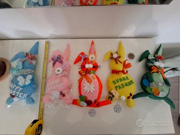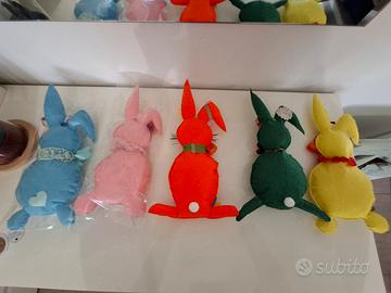 set di 5 conigli dietroporta. Morbidissimi. Realizzati interamente a mano con cura e attenzione nei dettagli. Con nastrini e applicazioni in legno e metallo. Nelle foto sono mostrati davanti e di dietro. Arriveranno ben confezionati. Possibilità di acquistare anche singolarmente. Dai un' occhiata al mio armadio.