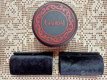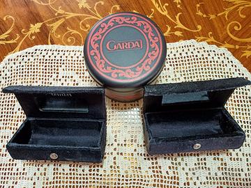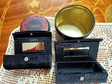 Il contenitore rotondo è in metallo leggero con colori predominanti rosso e nero, mentre gli altri 2 contenitori sono in pregiato materiale molto simile al velluto o all'Alcantara ma come si evince da chiare foto a corredo in pregiata fattura.