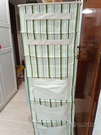 Portatutto pensile a 6 scomparti,nuovo mai usato,marca Ikea,altezza totale cm.110,ogni scomparto misura cm.34x30,parte interna profonda cm.da 13 a 21, 6 ripiani rinforzati alla base,6 tasche esterne laterali che offrono ancora più spazio per organizzare i piccoli oggetti,composizione misto cotone,colore bianco a righe verdi,base in legno. È facile da appendere e spostare grazie al fissaggio con nastro a strappo.Prezzo affare 12 euro.