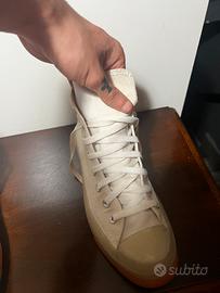 Iconiche Converse All Star alte, colore bianco con dettagli arancioni, taglia 41.5.