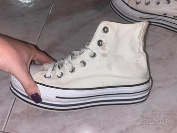 Converse All Star platform da donna, bianche e con piccola macchia nella zona laterale della scarpa sinistra.