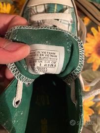 Vendo un paio di Converse All Star basse originali caratterizzate da una vivace fantasia tartan a scacchi sui toni del verde e del bianco, arricchita da sottili righe gialle. Un modello particolare e originale, perfetto per uno stile casual o grunge. • Tomaia: In tela resistente con stampa plaid uniforme. • Suola: Classica gomma bianca con riga nera, con pochissima usura. • Lacci: Originali bianchi, puliti. Le scarpe sono usate ma in ottime condizioni generali. La tela è pulita e i colori sono ancora vividi. La gomma della punta è bianca e non presenta graffi evidenti. La suola ha una normale usura da utilizzo cittadino, con ancora tutto il grip originale. Etichetta interna perfettamente leggibile.