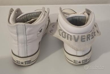 Vendo All star Converse bianche in pelle n 39 con linguetta posteriore che si può risvoltare con scritta. In alcuni punti ci sono piccoli segni gialli tipo colla fuoriuscita (come da foto). No scatola