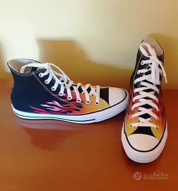 Vendo un paio di iconiche Converse All Star High, la versione con la stampa a fiamme (Flame Print) sui lati. Le scarpe sono una taglia 42 EU e si presentano in ottime condizioni generali, usate pochissime volte. La tomaia in tela nera e la stampa grafica con le fiamme rosse e gialle sono integre, e la suola in gomma non presenta alcun segno di usura. Il prezzo di vendita è di €60 ⚠️ Nota Importante: Le scarpe verranno consegnate senza la scatola originale.