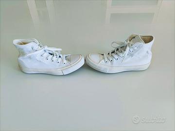 Offro Bellissime scarpe sneakers colore bianco, marca Converse, modello All Star Chuck Taylor II, N. 37,5 pari a cm 23. La scarpa è dotata di soletta con tecnologia “Lunarlon” che rende la calzatura leggera, morbida ed efficiente. Le scarpe sono praticamente Nuove, in quanto indossate un paio di volte. Tutto come da foto!