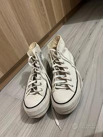 Vendo converse all star platform bianche, usate pochissimo come si può vedere dalla suola perfettamente intatta. Numero 39,5 ma veste tranquillamente dal 39 al 40.