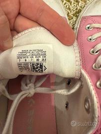Vendo per cambio taglia - purtroppo!!! - uno stupendo paio di Converse basse, color rosa baby, numero 40. Sono comodissime, impermeabili, uniche (edizione limitata con scritte azzurre sulla suola), usate con molta parsimonia infatti sono praticamente perfette. Imperdibili!