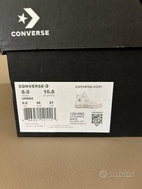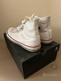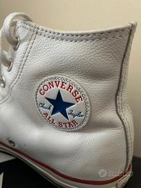 Classiche Converse modello high-top, in versione premium con tomaia in vera pelle bianca e dettagli in rosso e blu. Logo All Star laterale ricamato. Comode, versatili e perfette per ogni stagione.