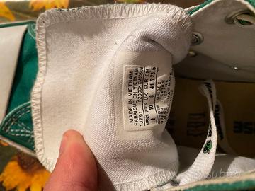 Le scarpe montano dei lacci bianchi personalizzati con la scritta "HANNOVER 96". Un dettaglio unico per appassionati di calcio o collezionisti di sneaker particolari. Includono la classica suola in gomma con riga verde coordinata alla tomaia. Le scarpe sono usate ma ben tenute. La gomma della punta e dei bordi è pulita, e la suola presenta una normale usura da utilizzo cittadino. Interni puliti ed etichette perfettamente leggibili.