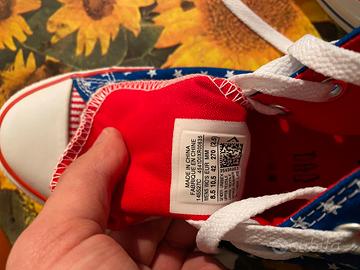 Vendo Converse originali modello alto in un'edizione speciale e vivace "Stars and Stripes", ispirata alla bandiera degli Stati Uniti. Un modello iconico e perfetto per chi ama uno stile pop, rock o semplicemente vuole un tocco originale. • Tomaia: Tela blu con stelle bianche stampate, linguetta e retro con strisce bianche e rosse. • Fodera: Interno rosso a contrasto. • Patch: Logo classico circolare sulla caviglia. Le scarpe sono usate ma in ottime condizioni. La stampa è nitida e i colori sono vividi. La tela è integra e pulita. Suola in gomma bianca in ottimo stato, con usura minima e battistrada ben visibile. Lacci originali bianchi inclusi.