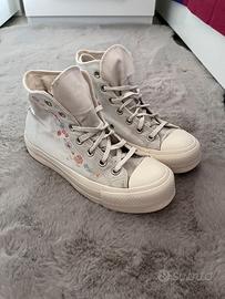 Converse numero 37.5 (EUR), color panna con fiori colorati ricamati ai lati, da notare le suole colorate in lilla e giallo. Scarpe platform con lacci.