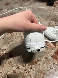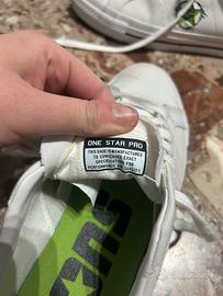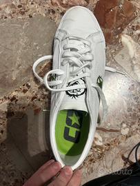 Vendo fantastiche sneakers Converse Cons One Star Pro, edizione limitata o personalizzata con un design unico. • Modello: One Star Pro (linea skate di Converse, più robusta) • Colore: Bianco con grafiche esclusive "Skunk" in verde e nero • Design Speciale: Il logo laterale a stella è stilizzato con un motivo a molfetta e dettagli a ragnatela. Grafica Skunk anche sulla linguetta e scritta "SKUNK" sul tallone. Interno verde neon con logo Cons.