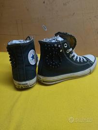 Vendo paio di scarpe vintage edizione limitata della CONVERSE. Di colore nero con decorazioni nere a pallina. Le decorazioni sono sulla linguetta e sul lato esterno,e formano il simbolo della pace. Lo stato di conservazione generale è buono.Sono presenti normali segni del trascorso. La taglia disponibile è il 38. Si effettuano spedizioni a carico del destinatario. Prezzo: 50€
