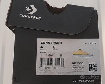 Vendo Converse unisex in tessuto di cotone giallo/arancio n. 36 e 1/2. Le ho acquistate quattro anni fa. Indossate solo due volte. Ci sono segni di utilizzo nella parte interna del tallone. Non le uso più perché ho acquistato delle Superga di un colore senape che mi piace di più. Se interessati il ritiro è in zona Murri.