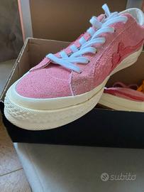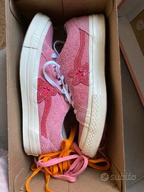Scarpe Converse modello Golf Le Fleur , colore rosa, unisex, numero 39,5, complete di due paia di stringhe (un paio rosa e uno arancione) oltre a quelle bianche. Usate ma in ottimo stato