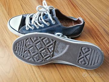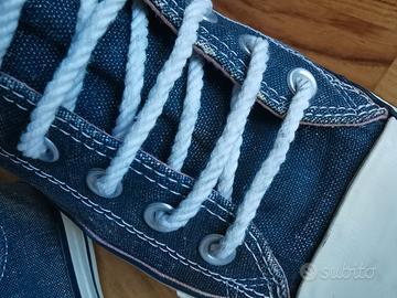 Converse da donna, colore jeans leggermente scintillante, rosa dentro, laccetti di corda marina, misura 39. Ottime condizioni.