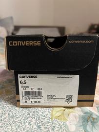 Converse da donna, basse in pizzo macramè argento. Usate molto poco, complete di scatola originale IN EVIDENZA SULLA FOTO 5 E 6: piccola macchia sulla gomma bianca e sui lacci. Taglia 37 EU - 6,5 USA - 23,5 cm