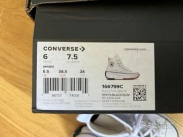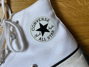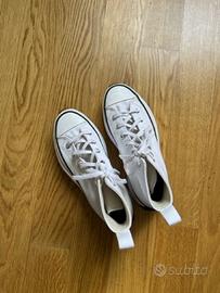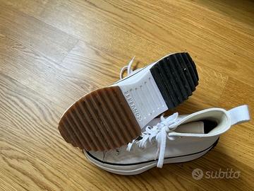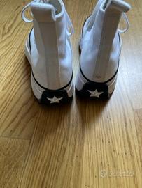 Scarpe Converse con suola platform in gomma dentellata. La punta è in gomma, la suola è bicolore e il tallone è arrotondato. Il resto della scarpa è in tela. Usate un paio di volte ma sono un pò larghe per me, sono praticamente nuove.