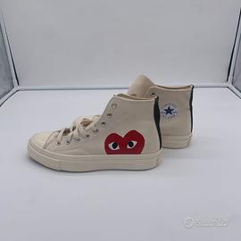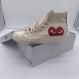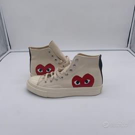 Il tuo cuore sulle tue scarpe con la sneaker Converse x Comme des Garçons PLAY Chuck 70. Questo modello street-ready sfoggia i dettagli Chuck premium che conosci e ami, abbinati a una stravagante grafica con cuore e occhi che spicca appena sopra la suola. Attira gli sguardi di tutti.
