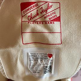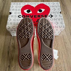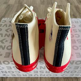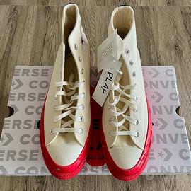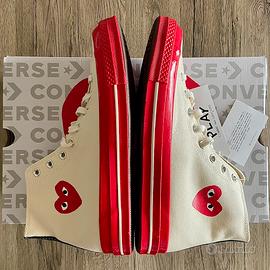 Nuove Converse x COMME DES GARÇONS. Nate dalla collaborazione tra il colosso americano con la casa di moda giapponese ora acquisita francese, le scarpe sono caratterizzate dal classico taglio della sneaker iconica, il modello All Star 70 OX, rivisitato per far spazio al logo della maison, dove campeggia il famoso “cuore”. Dal colore bianco off-white, la scarpa propone la classica suola in gomma che qui viene stravolta e colorata di rosso. Modello alto, il logo “CDG” appare sia nella suola che sull’etichetta QR code per verificarne l’autenticità. Ad un prezzo scontato, questo è l’ultimo pezzo rimasto in taglia EU 45 / US 11 #allstar #converse #commedesgarcons #cdg #heart