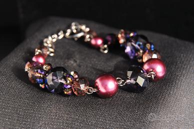 Parure composta da girocollo, orecchini e bracciale anallergici. Cristalli squadrati viola chiari e scuri si alternano a palline nella stessa tonalità di colore. La collana è lunga cm 42, estensibile fino a cm 48 con la prolunga in dotazione. Il bracciale misura cm 19 - 24 con la prolunga. Gli orecchini sono lunghi cm 4,5.