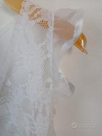 Lunga, modello incrociato con cinturino piccolo interno e uno più grande esterno per la chiusura, colletto importante in pizzo floreale ricamato, maniche lunghe parte finale in pizzo a campana, bordino in pizzo nella cucitura sotto il seno.