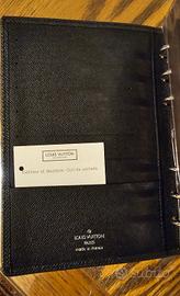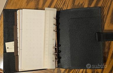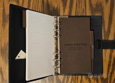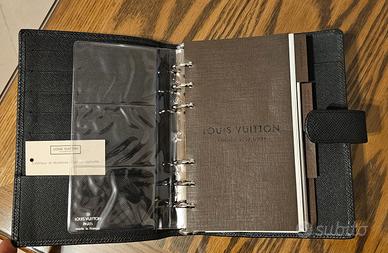 Con logo LV, fodera in pelle martellata, chiusura con bottoncino a pressione, raccoglitore a 6 anelli, 6 fessure per carte di credito, 2 scomparti interni.