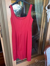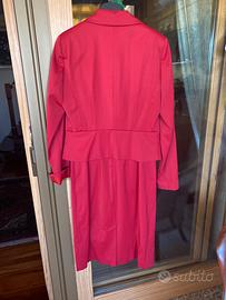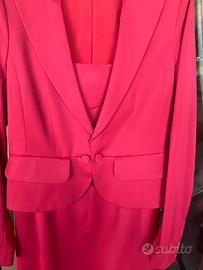 Completo rosso, abito attillato, con spacco posteriore, e ampia scollatura. Giacca corta, con tasche anteriori. Tessuto elegante. Taglia 46. Lunghezza appena sotto il ginocchio. Indossato una volta