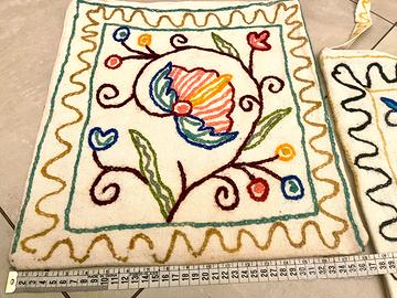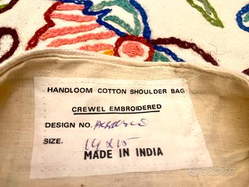 Bellissima Coppia di Nuove Originalissime Borse Etniche in robusto Tessuto (simil juta) mai utilizzate, interamente ricamate a mano complete di talloncino di provenienza cucito all’interno.Misure presenti in fotografia.